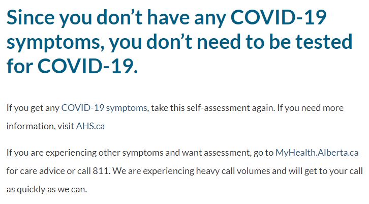 Alberta health services covid 19 self assessment. You do not need to be tested for covid 19. All albertans are eligible for covid 19 testing and can book an appointment online for the upcoming week if you live within 75 kms from a testing assessment centre. If you have any of the following symptoms you will need to immediately self isolate. Cough fever shortness of breath difficulty breathing runny nose or sore throat.